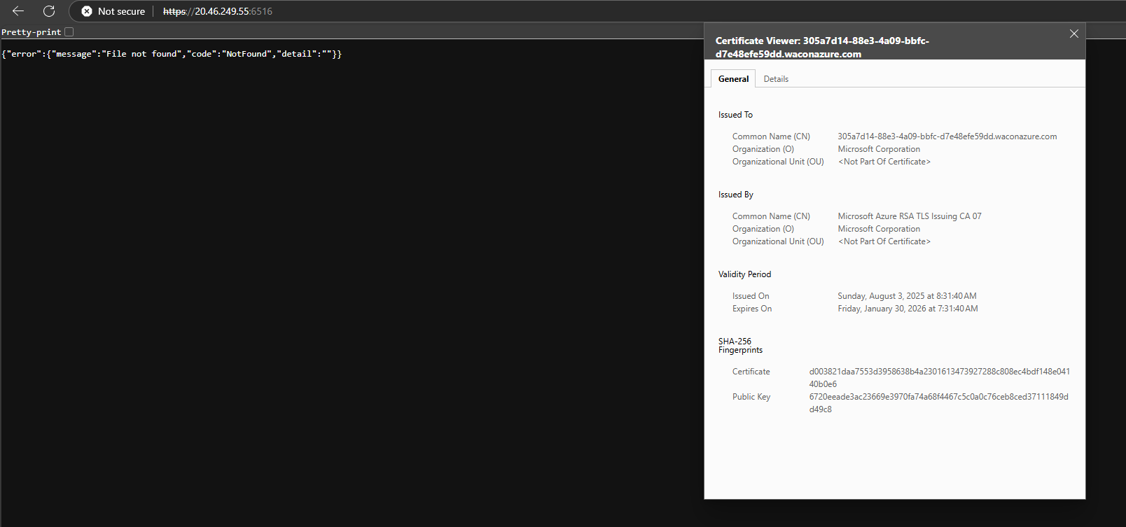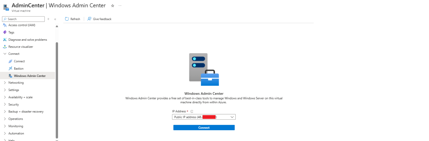 The Connect tab has a pre-requirements check. Azure verify that the user has the Windows Admin Center Administrator Login Azure role, opens the WAC API port (6516) via Just In Time mechanism and allows access through a gateway URL <Unique DNS>.<location>.waconazure.com:6516 but, to our surprise, during the JIT access, the port is exposed directly through both VNet IP and External IP (if configured) addresses.