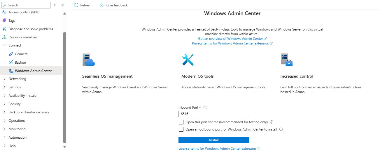 When setting up a VM in Azure or joining an existing windows server machine using the Azure ARC service, the Azure portal page of the machine offers few different administrative connection methods. One of them is Windows Admin Center. When visiting that page for the first time, the user gets an option to automatically install the management software directly from the portal: