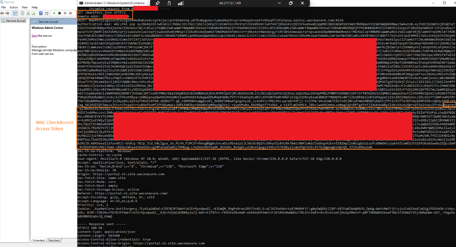 - The Windows Admin Center server does not properly validate the tokens provided. It fails to enforce binding between the PoP token and the WAC.CheckAccess token’s user identity (UPN), allows the use of non-gateway DNS values in the URL field, and accepts reused nonces and arbitrary HTTP methods. This enables an attacker to combine a stolen valid WAC.CheckAccess token with a forged PoP token of a completely different user, effectively bypassing identity checks and escalating privileges.