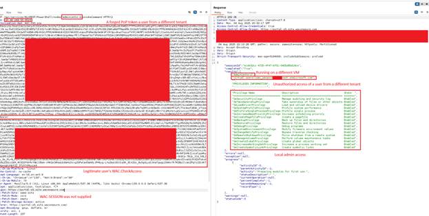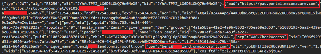 Most critically, the Windows Admin Center server does not validate that the User Principal Name (UPN) in both tokens is the same. This allows an attacker to mix tokens from different users. For example, a stolen WAC.CheckAccess token from a privileged user can be combined with the attacker’s own PoP token, resulting in unauthorized access and privilege escalation.