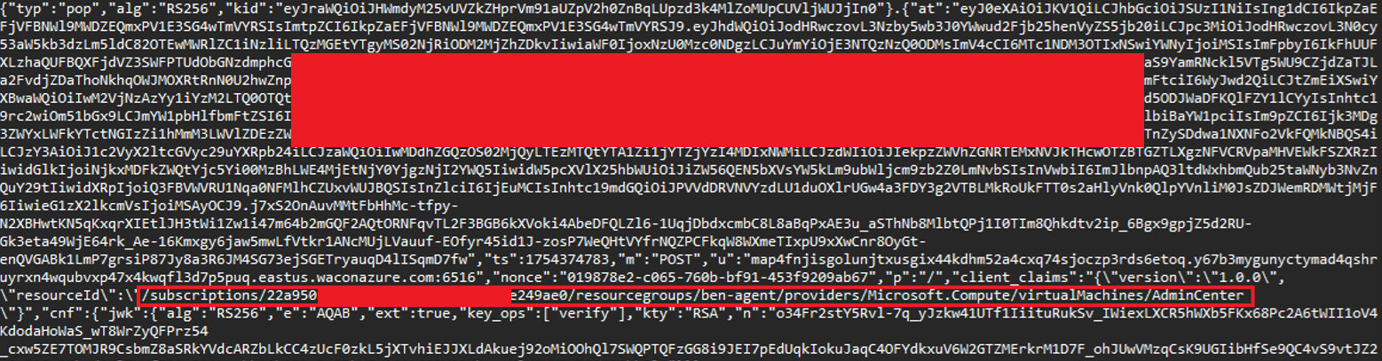 The other token received in the flow (PoP token), or the instance metadata accessible from the machine, can disclose additional contextual information, such as the subscription ID and resource group associated with the target virtual machine: