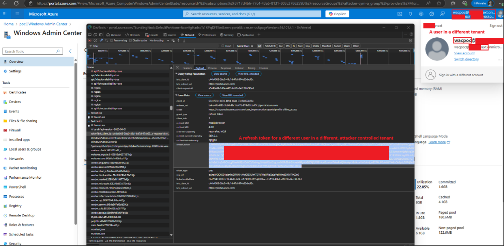 Step 4: The attacker proceeds to forge a PoP token. This can be achieved by leveraging an attacker-controlled tenant: the attacker creates a user within that tenant and extracts a refresh token, which can then be used to obtain an access token for the sso.portal.waconazure.com audience, since many fields within the PoP token are not validated (including the PoP access token itself), it will be accepted even though the token originates from a different tenant. This token is later used as part of the unauthorized request chain: