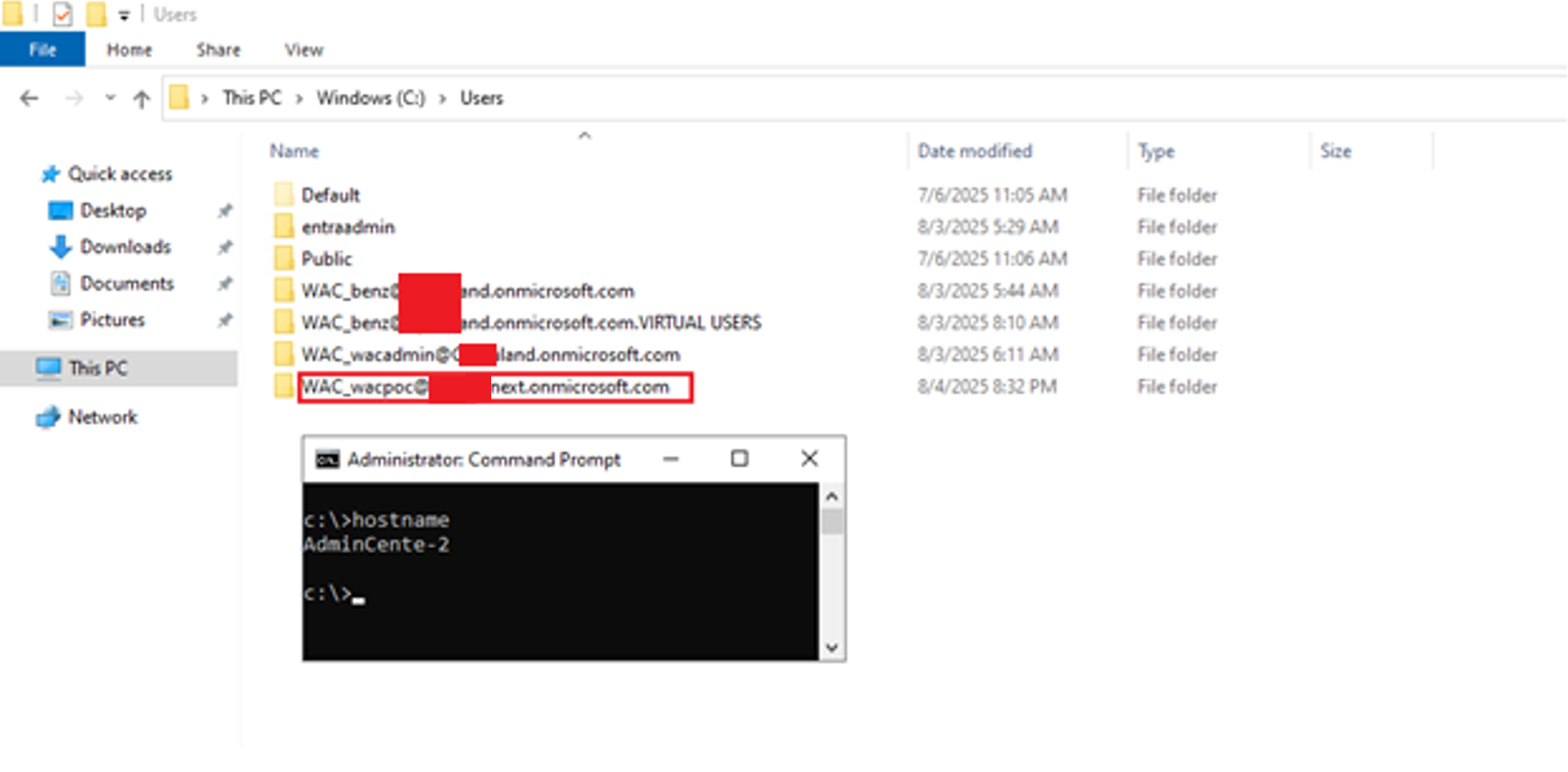 A key indicator of compromise is the creation of a virtual account and corresponding user profile directory using the UPN format of the authenticating identity in addition to WAC_ prefix, e.g.: WAC_benzamir@<tenant>.onmicrosoft.com. The presence of a virtual account associated with an unknown or external tenant domain may indicate unauthorized access and command execution via WAC.