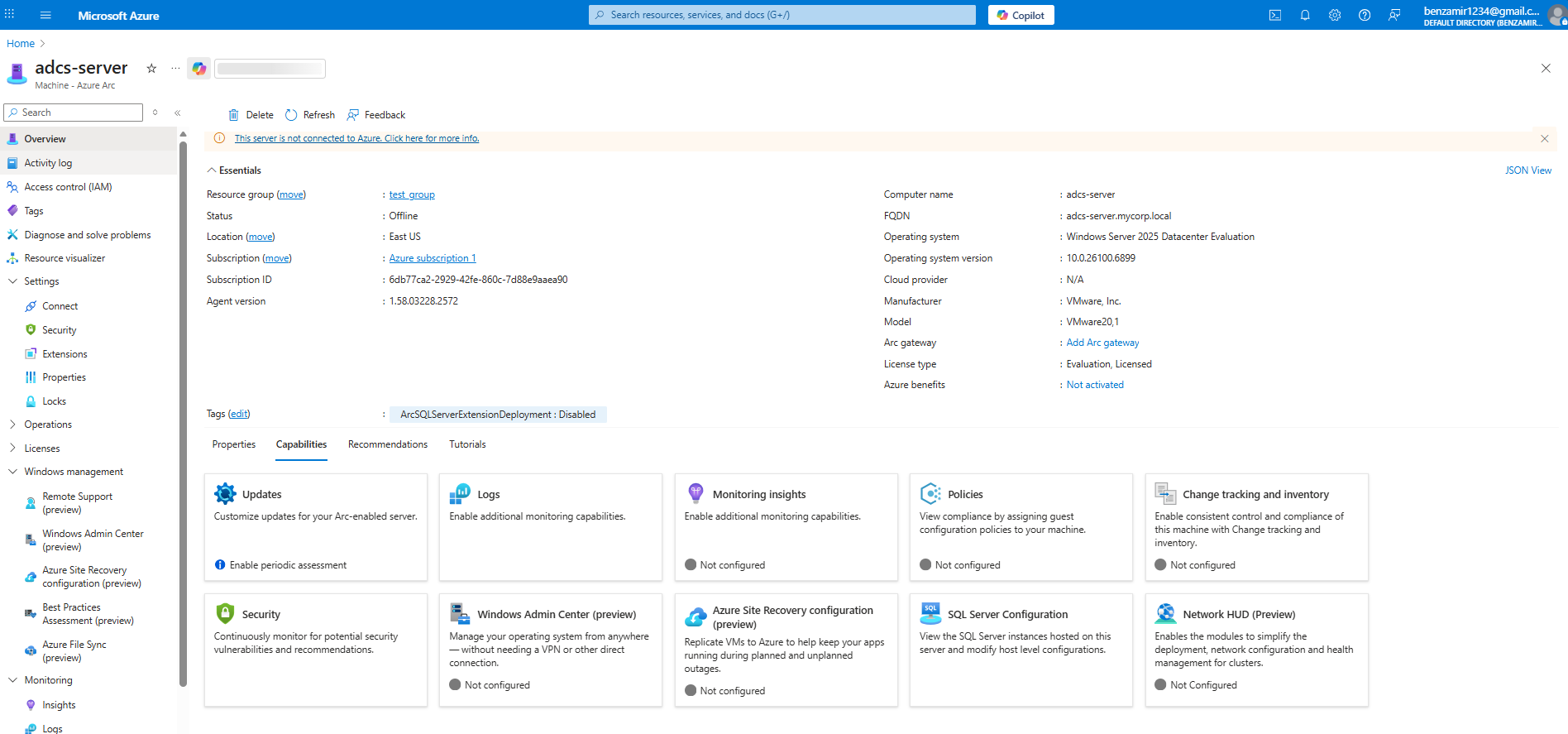 Once a machine is successfully connected to Azure Arc, it becomes fully manageable through Azure. Administrators can: