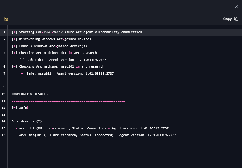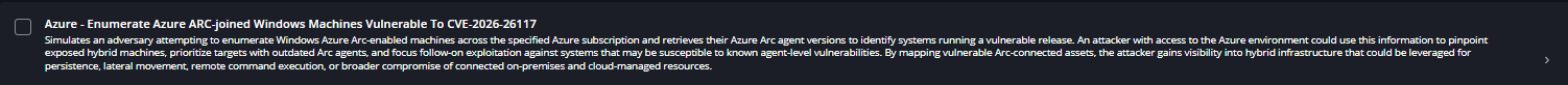 On March 10, 2026, Cymulate Research Labs introduced a new attack scenario in Cymulate Exposure Validation that actively enumerates Azure Arc–joined machines, simulating an adversary attempting to identify systems running a vulnerable Arc agent. This simulation enables organizations to validate security control detections while confirming that all deployed Arc agents are updated and not susceptible to the vulnerability.