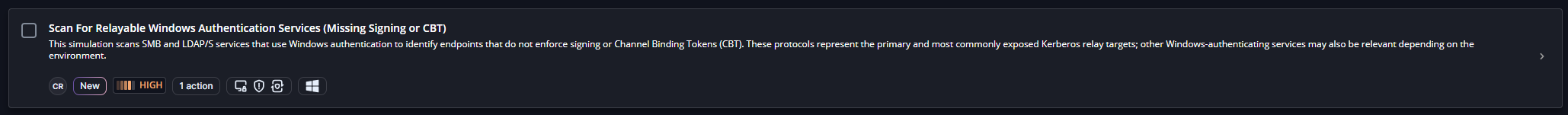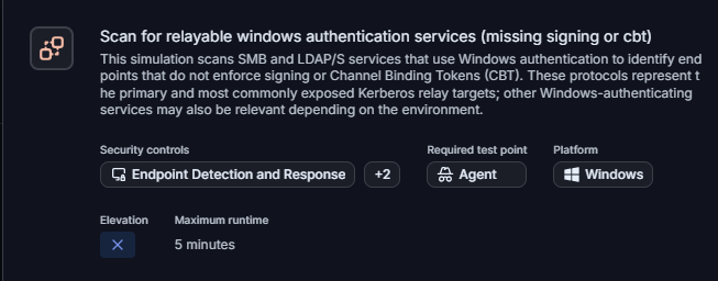 On January 15, 2026, we updated Cymulate Exposure Validation with the attack scenario Scan For Relayable Windows Authentication Services (Missing Signing or CBT). This production-safe attack scenario executes the expected network service discovery (T1046) that an attacker would use to identify vulnerable endoints and execute the attack described in this blog.