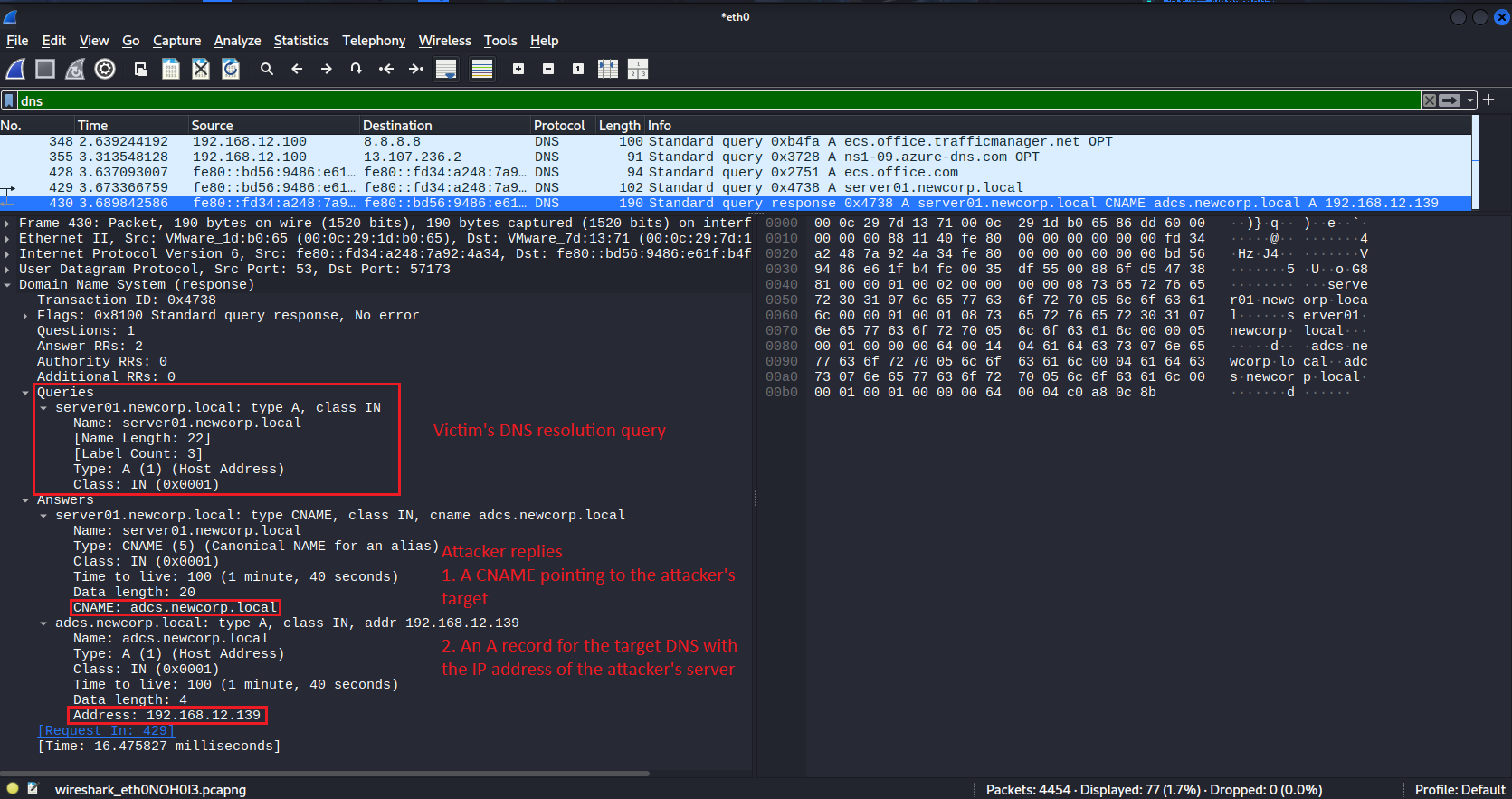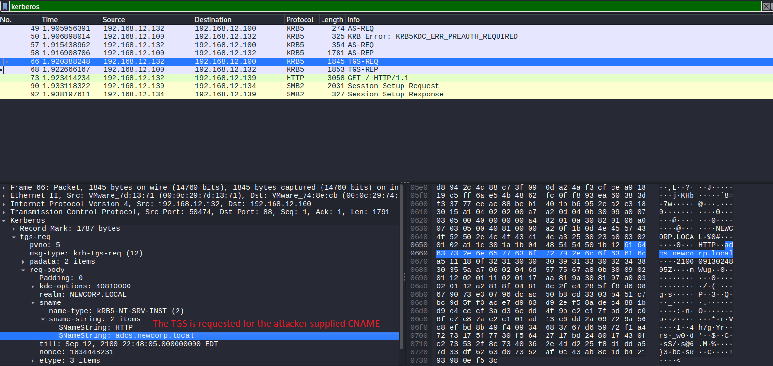 This provides both the alias (CNAME) and the actual IP resolution in one response causing the victim to automatically and unknowingly, request a TGS for the attacker-chosen Service Principal Name instead of the one originally intended.