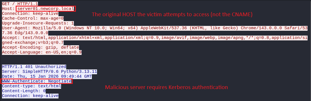 After a successful DNS record poison, the victim accesses the attacker’s rogue HTTP (or SMB) server. The attacker responds with a 401 message, requesting Kerberos authentication: