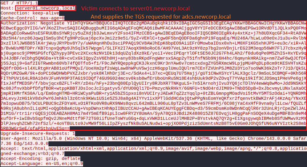 The victim attempts to access the intended server but unknowingly, his machine requests a TGS for adcs-server.mycorp.local instead and forwards it to the attacker.
