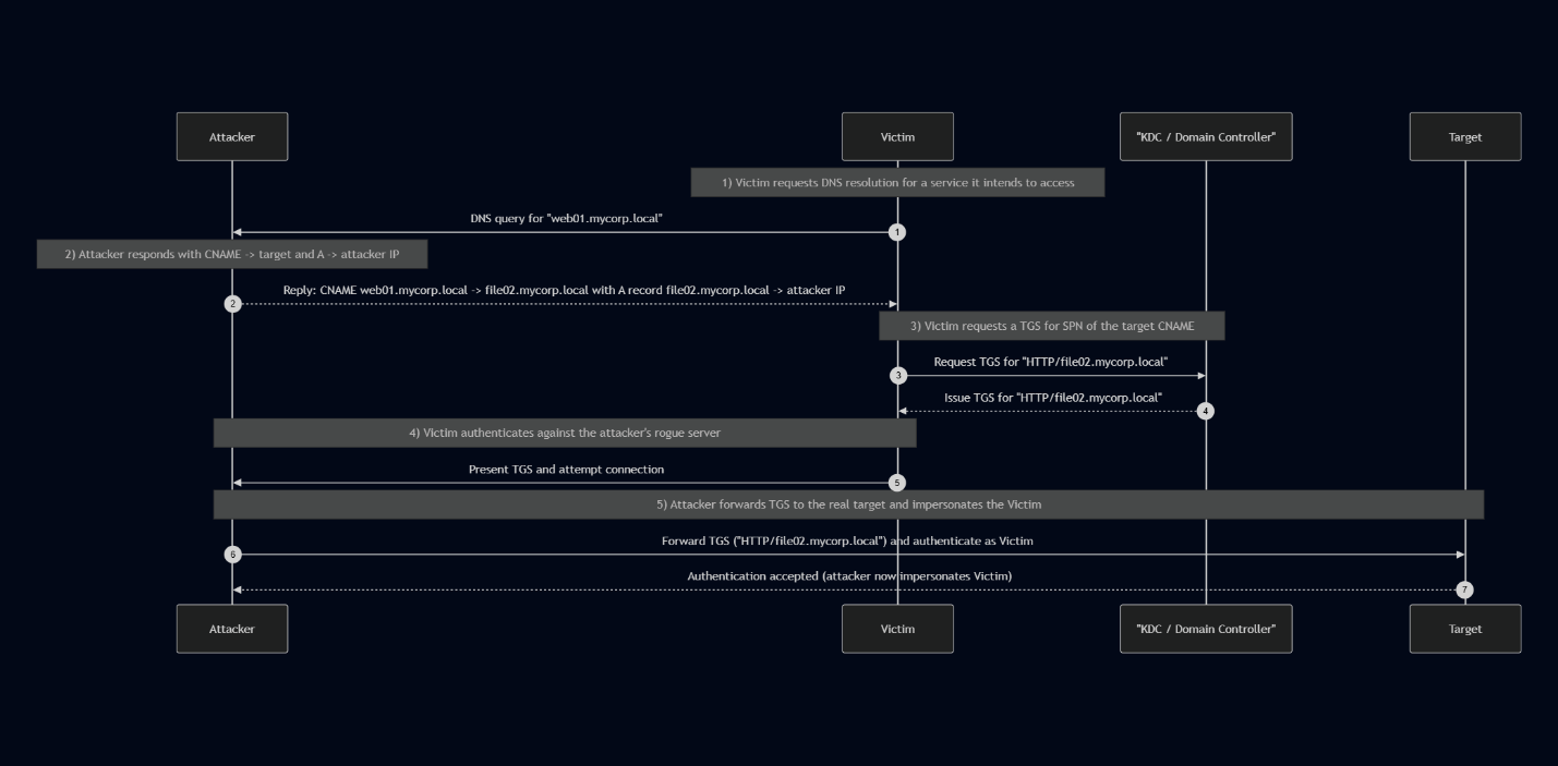 By abusing the interaction between Kerberos TGS requests and DNS CNAME resolution, this technique allows an attacker positioned on-path to coerce Windows clients into requesting user service tickets for attacker-chosen Service Principal Names. These tickets can then be relayed across protocols such as SMB and HTTP in environments where signing or Channel Binding Tokens (CBT) are not enforced, enabling user impersonation without ever knowing the victim’s password.