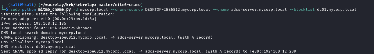 The attacker sets up a malicious DNS server. For the proof of concept, I cloned the MITM6 tool and extended it with the necessary functionality to support Kerberos CNAME abuse relaying, leveraging both DHCPv6 and ARP poisoning techniques.