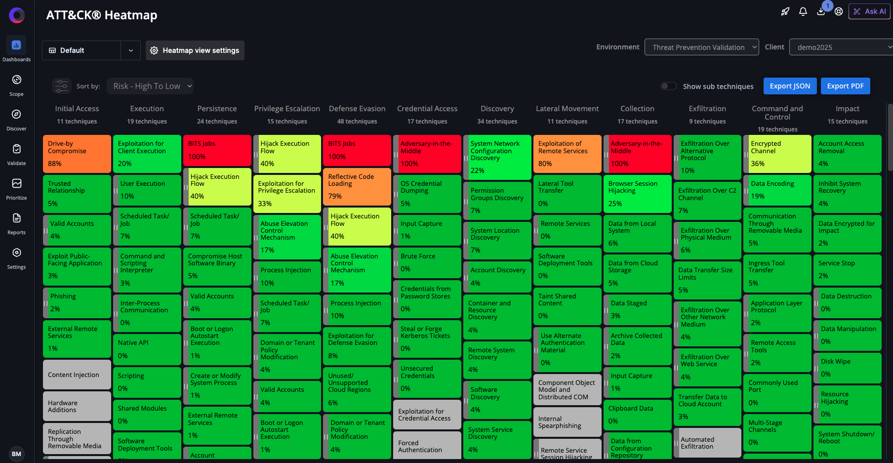 By continuously validating against new techniques, Cymulate helps organizations identify gaps and build resilience—while measuring validated prevention and detection in the MITRE ATT&CK heatmap.