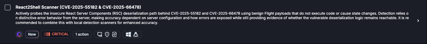 In practical terms, this means you can proactively test your public-facing (or internal) React/Next.js servers to assess exposure, without minimal risk.