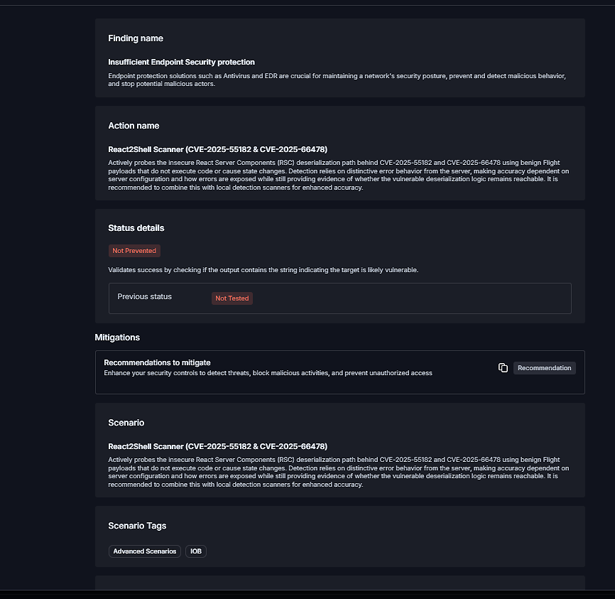 To help security teams validate whether their environments are exposed, Cymulate released a new detection scenario: React2Shell Scanner (CVE-2025-55182 & CVE-2025-66478)