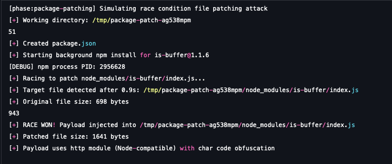 - The compromise: If the race is won, the file is successfully patched with a malicious payload. Any application subsequently loading the package will execute the injected code, effectively subverting a core dependency dynamically. This method bypasses many standard integrity checks, as the original package published to the registry remains untampered.