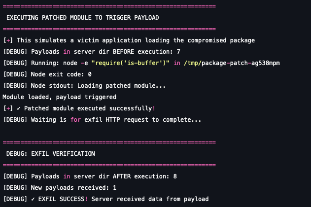 - Targeted exfiltration: Once we require the patched module, the module will exfiltrate test data to the webhook server configured in the attack scenario, to mimic the real exfiltration done in the shai-hulud attack.