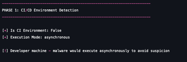 - CI/CD environments: If the script detects indicators like GITHUB_ACTIONS or GITLAB_CI, it proceeds to the full harvest and exfiltration immediately, prioritizing speed in a time-sensitive environment.