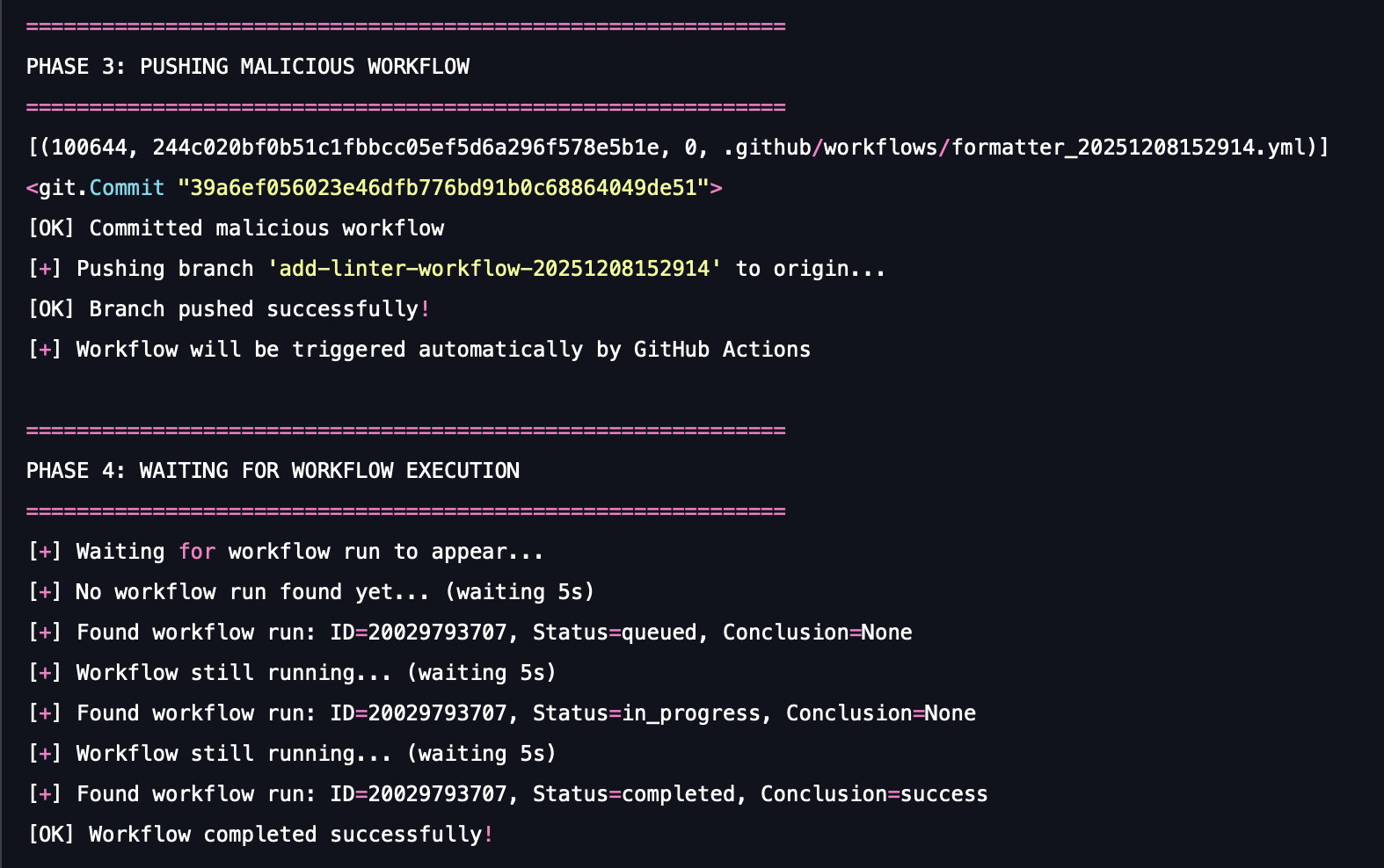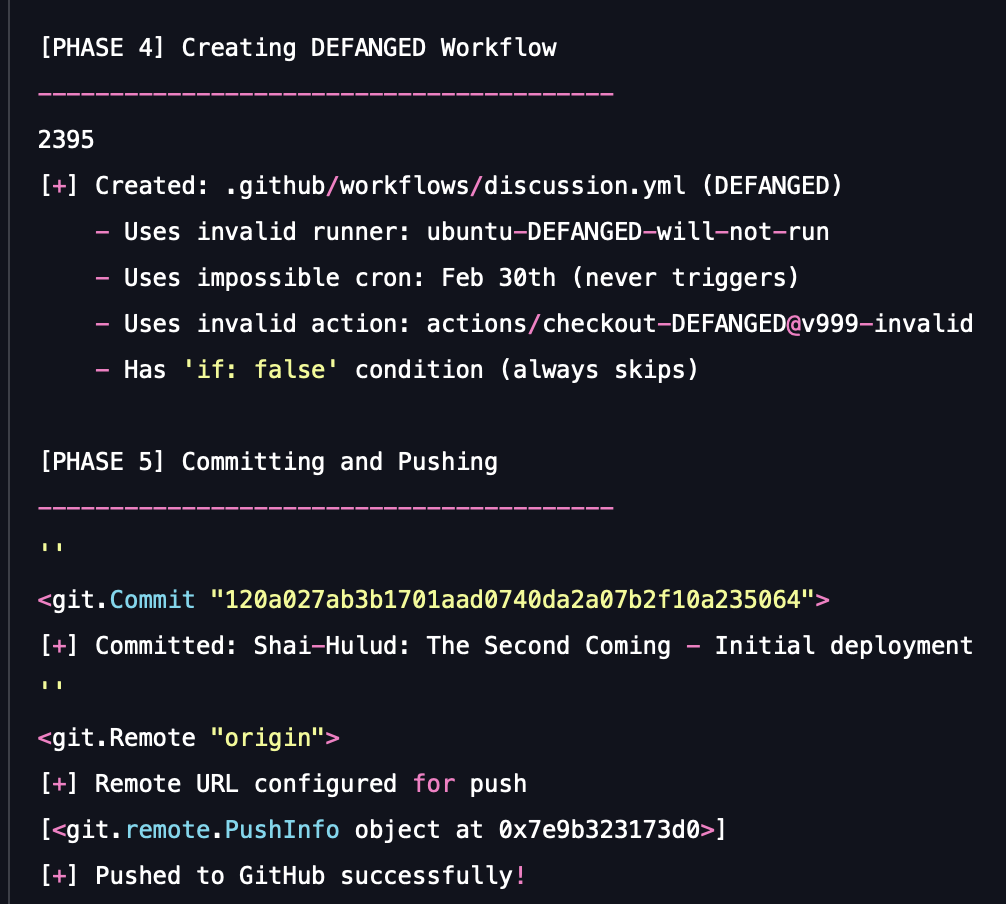 - Persistence injection: Crucially, the attack includes a persistence mechanism by committing a malicious workflow file (e.g., .github/workflows/discussion.yml). This is designed to ensure future access and continued repository modification, even if the initial exploit is patched.