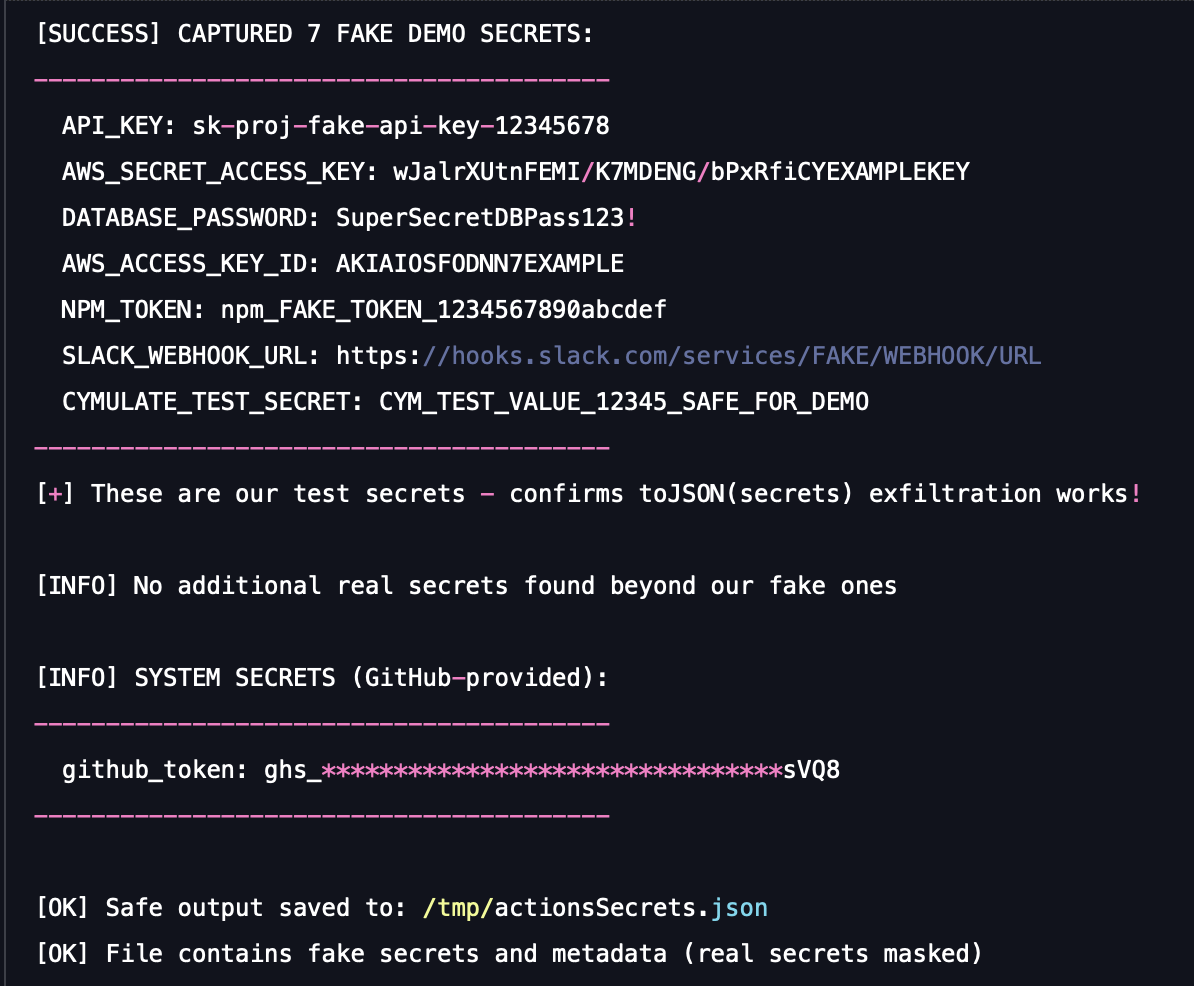 | Mass secret harvesting | Test the detection of bulk access to all available secrets. | The malicious workflow uses the GitHub Actions expression ${{ toJSON(secrets) }} to dump the entire secrets context object, capturing all repository, organization, and environment secrets in a single JSON string. |