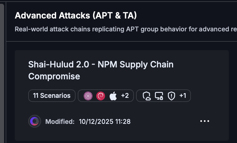 These scenarios are available now on the Cymulate platform. We even created a template called “Shai-Hulud 2.0 - NPM Supply Chain Compromise” that will execute the full npm supply chain killchain in just a few clicks.