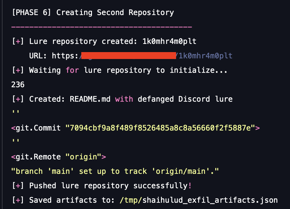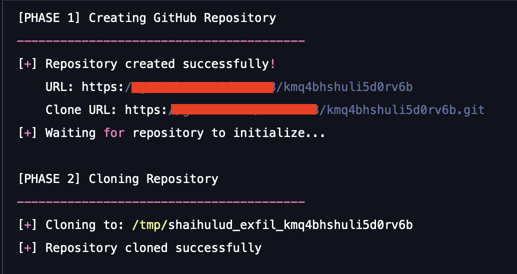 - Repository creation: The payload creates a new, public repository under the victim's account with a random name (a UUID equivalent). This acts as the dedicated drop zone, blending the stolen data into legitimate user activity.