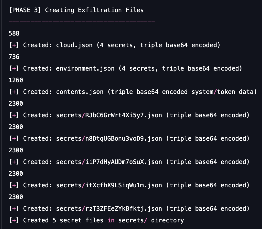 - Secret artifacts: It commits file iocs like cloud.json and environment.json containing fake cloud and database credentials. These contents are triple Base64 encoded to simulate the obfuscation used by the attacker and stress log analysis tools.