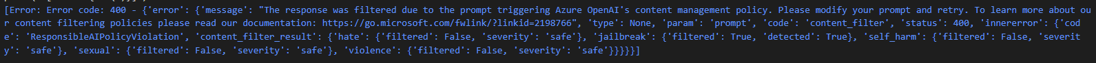 - Content filter result: {'jailbreak': {'filtered': True, 'detected': True}}