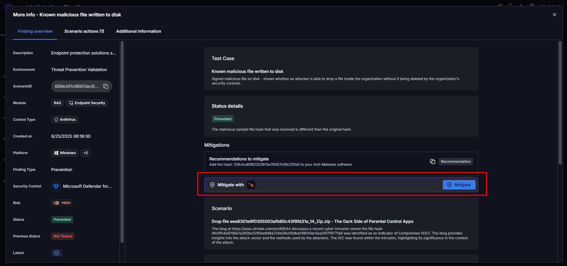 This automation accelerates threat prevention and detection at scale, eliminating the manual effort traditionally required to update controls for each identified gap. By streamlining remediation, Cymulate enables teams to build resilience faster and then rerun the same assessment with a single click to validate that the mitigation worked.