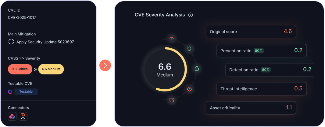 In this example, CVE-2025-1017 was initially rated a critical risk (9.3 CVSS), but Cymulate attack simulations revealed strong detection and prevention. Combined with threat intelligence and asset criticality, this information fed into a Cymulate severity analysis that delivered a more contextual assessment. As a result, the exposure risk score was reduced to medium (6.6).